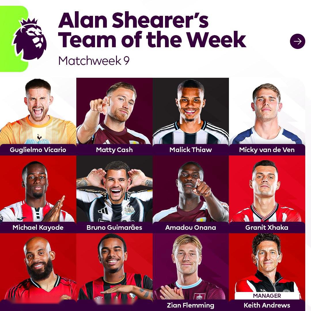 英超官方发布了阿兰-希勒评选的英超第9轮最佳阵容,姆伯莫、扎卡、范德芬、维卡里奥等人在列。